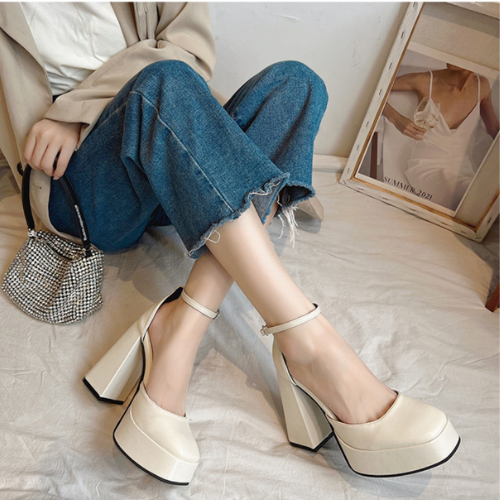 How to look stunning when wearing cream-colored square-heeled high heels? Many women currently choose this style of high heel shoe.